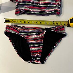Fun and flattering two-piece bikini set featuring a vibrant multicolor striped pattern. The top has a structured V-wire neckline with adjustable straps for a secure and stylish fit. The matching bottoms offer full coverage with a cute gathered side detail for added flair. Perfect for pool days or beach getaways!