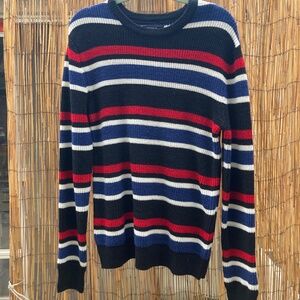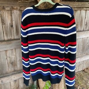 Forever 21 - Black, dark blue, red and white striped cable knit sweater with a relaxed fit in excellent condition, Size M. 19” pit to pit, ~20” shoulder width, 28” shoulder to cuff / sleeve, 29” length collar to hem.