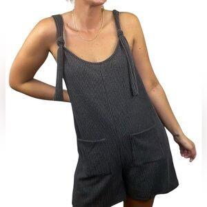 Chic and comfortable, this striped black jumpsuit is perfect for any occasion. Featuring a stylish design with adjustable straps, it's a must-have addition to your wardrobe. Undershirt not included.