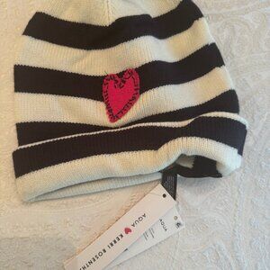 Stylish and cozy, this black and white striped knit hat features a charming pink heart patch. Perfect for adding a touch of warmth and style to any outfit.