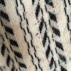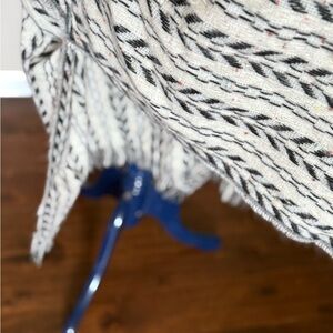 Stylish knit poncho with black and white stripes. Perfect for layering.