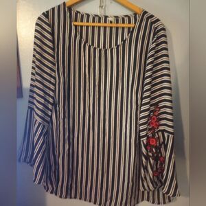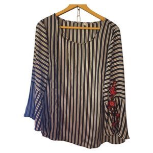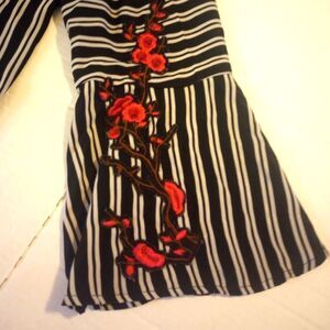 Stylish black and white striped blouse with floral embroidery on the sleeves. Perfect for casual or formal occasions.