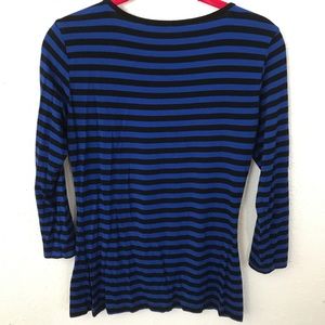 Royal Blue and black stripe blouse with 3/4 sleeves and outer arm expose with buttons up and down on outer side of arms making it an unique blouse
