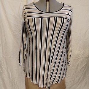 This blouse has Brown and black stripes on an off white background. Very stretchy, form hugging material. Flattering scoop neckline. New w/out tags
