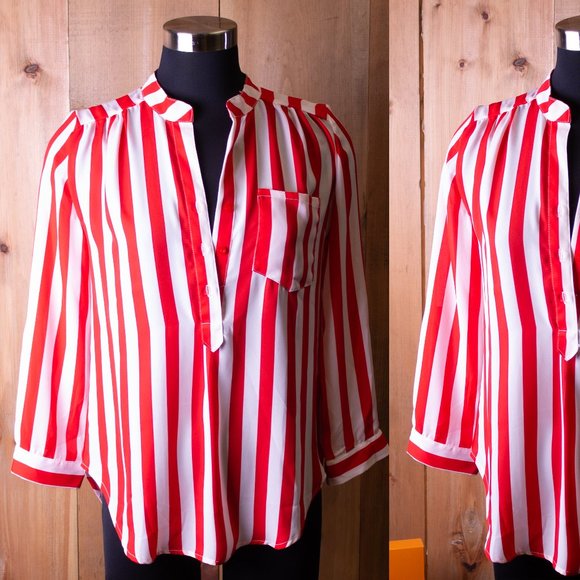 Features a sheer fabric, bold red and white stripes, 3/4 sleeves, and curved hem.