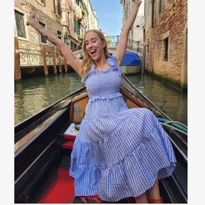 Striped Blue White Midi Dress Tie Straps Shirred Ruffle Detail