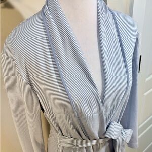 Enjoy comfort and style with this elegant striped blue robe. Perfect for lounging, this robe offers a soft touch and a flattering fit.