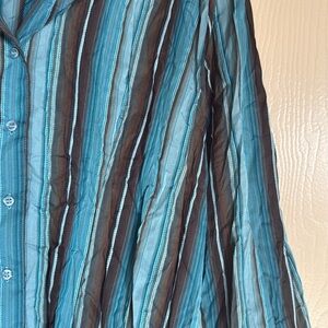 Stylish button-up shirt with blue and brown stripes. Perfect for casual or formal wear. Really cool “crinkly” type of fabric. Cowgirl western style Ish.
