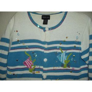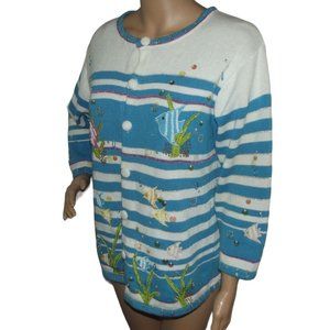 Charming blue and white striped sweater featuring playful fish embroidery. Perfect for adding a touch of whimsy to your wardrobe.