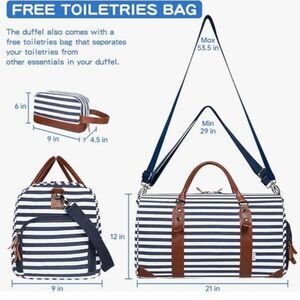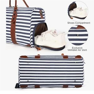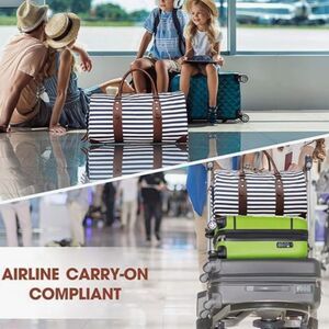 Stylish and spacious travel bag featuring a classic blue and white striped design with elegant brown accents. Perfect for weekend getaways or daily use.