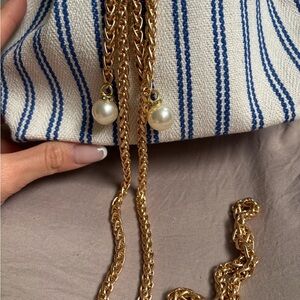 Chic and stylish, this striped blue and white bag is perfect for any occasion. The elegant design features gold accents, adding a touch of luxury to your ensemble.