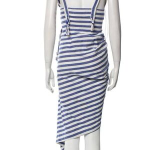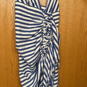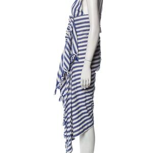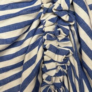 Stylish tote bag with blue and white stripes. Features a unique ruched design. Perfect for casual outings.