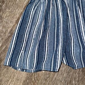 blue and white striped jumpsuit. with a button closure and ruffled sleeves. It has a cold-shoulder design with short, ruffled sleeves and a button-down front. The romper also features an elastic waistband.