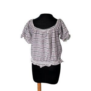 This boho-inspired blouse is a stylish addition to any wardrobe. The off-shoulder design and ruffle hem create a chic silhouette, while the button-up detail adds a classic touch. The striped pattern lends a casual yet refined look, suitable for various occasions.