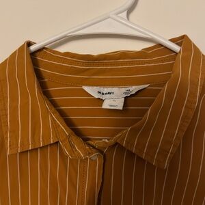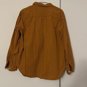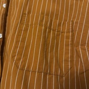 Super cute button down shirt. Mustard yellow with vertical white-ish stripes. Super comfortable and fresh. Perfect to use closed down to the office or open over a tank on a summer day