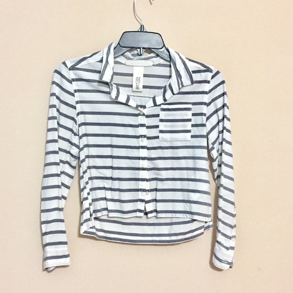 This is a striped button up with a collar and a pocket that can be styled with jeans and leggings!
