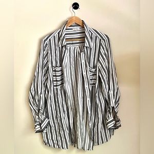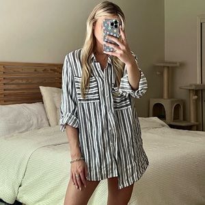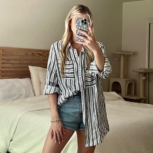 *Oversized* Long navy and white striped button up. Perfect closet staple that can be buttoned up or layered over a crop top!