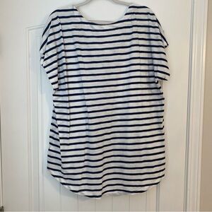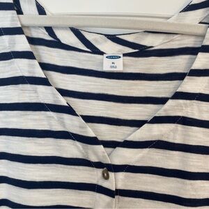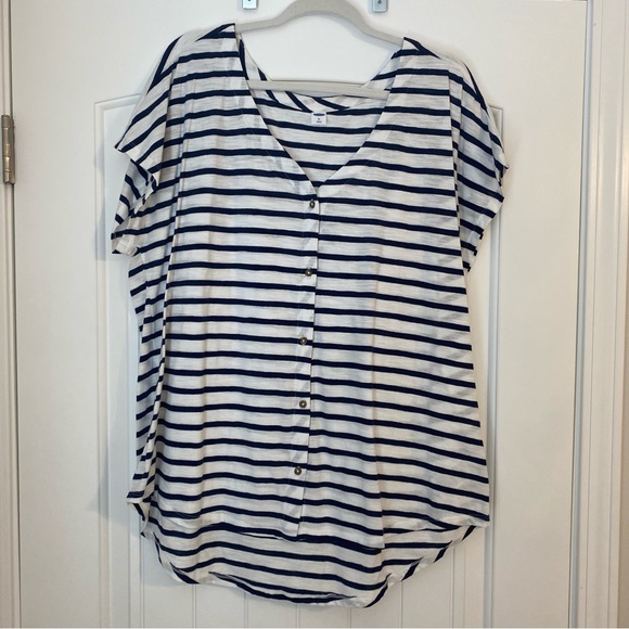 Blue and white striped button up with a v-neck. Buttons are functioning. Has a curved bottom hem. Barely worn. Great condition.