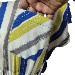striped blouse women, button back top, blue yellow striped shirt, short sleeve tunic top, elastic waist blouse, summer top medium, Tomas Maier style, resort wear blouse, casual work top
