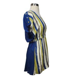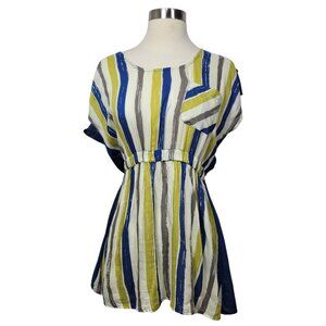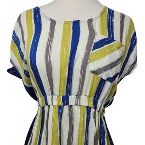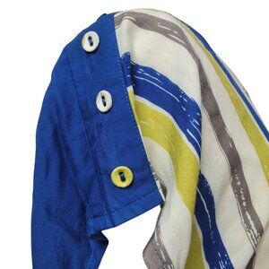 Striped Button-Back Short Sleeve Top Size Small Blue Yellow White Elastic Waist