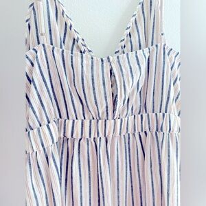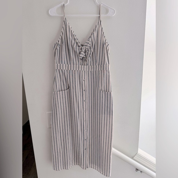 Stylish striped button-down dress with pockets. Features a chic bow detail on the front.