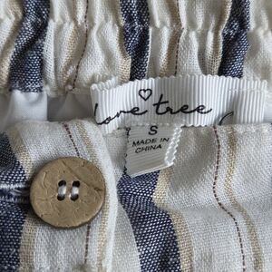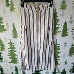 Stylish striped button-down linen skirt with pockets. Features a mix of blue, white, and tan stripes. New and in perfect condition.