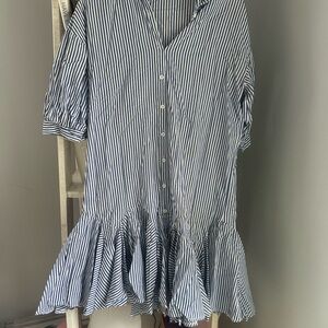 Chic striped button-down dress with ruffle hem. Perfect for casual outings.