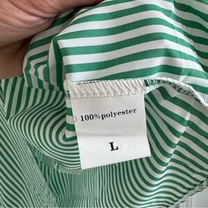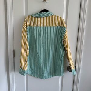 Stylish striped button-up shirt in green and yellow stripes. Perfect for a casual day out.
