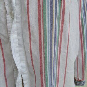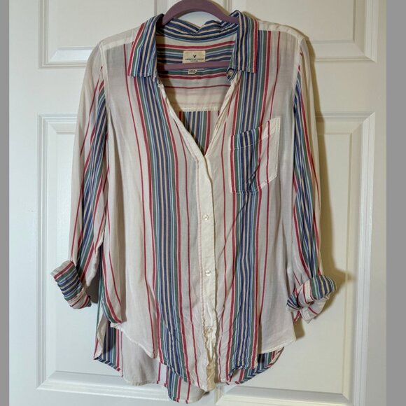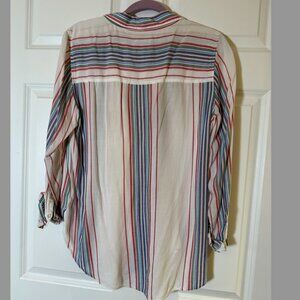 Stylish striped button-up blouse with a blend of colors for a chic look. Perfect for casual or office wear.