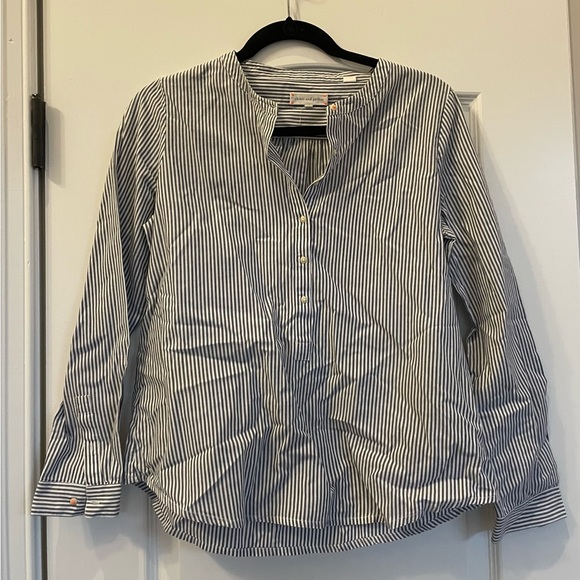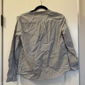 Stylish striped button-up blouse with long sleeves. Features a classic design with a comfortable fit.