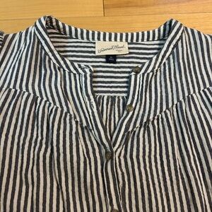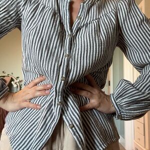 Super cute and versatile button up blouse from Wild Fable. Loose fitting and comfortable, size XS (though fits like a S or even a M. Easily dressed up for work or down for casual wear. Features slightly puffed sleeves at their start as well as classic white and grey stripes throughout top. Very good condition. See photos for measurement. Non smoking home.