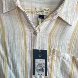 Stylish striped button-up shirt with a pocket. Features white and yellow stripes.