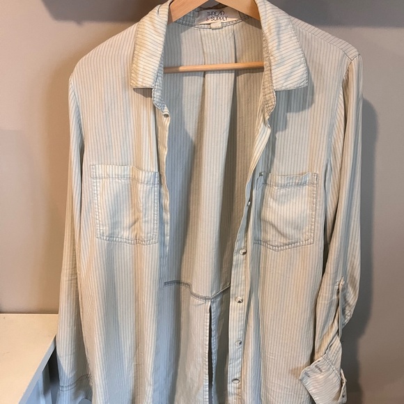 Stylish striped button-up shirt. Features a classic collar and two front pockets. Perfect for casual or formal wear.