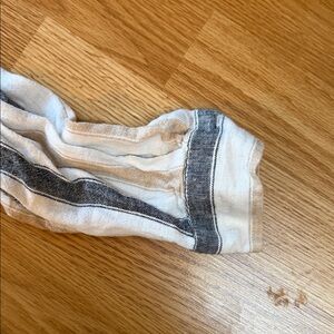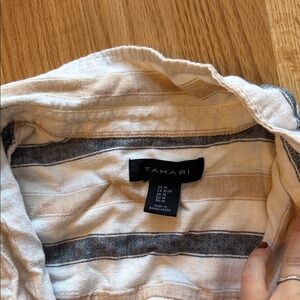 Casual striped button-up shirt. Features white and gray stripes. Great beach over up