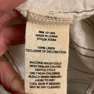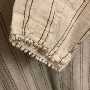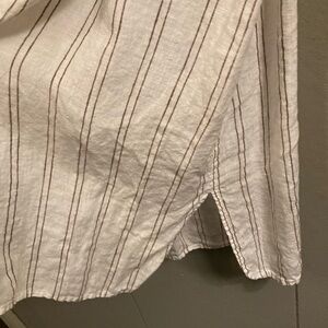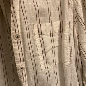 Casual striped button-up tunic with a relaxed fit. Features a front pocket and three-quarter sleeves. Perfect for layering or wearing alone. Has small side slits. Cute detail around sleeve hem.