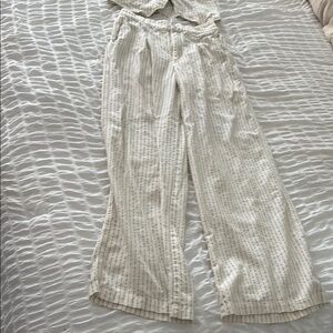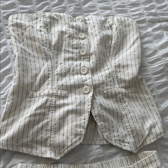 Stylish cream and gray striped vest with button-up front. Features two front pockets. Matching pants included in the next picture
