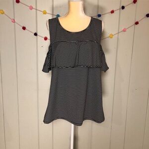 Elevate your style with this chic striped cold shoulder top. Featuring a stylish ruffle detail, this black and gray top is perfect for any occasion.