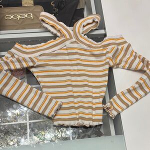 Stylish cold shoulder top with orange and white stripes. Perfect for casual outings.