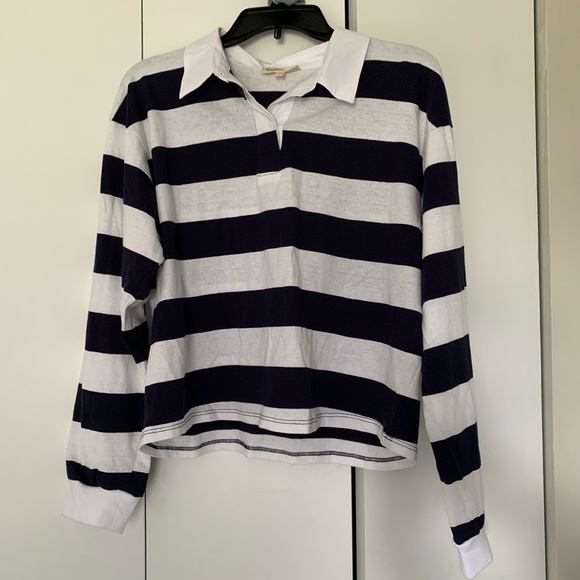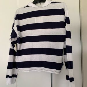 Navy blue and white striped long sleeve with buttons and a collar. Not totally a crop top, but is a little shorter than a normal shirt. Never worn and still in great condition!