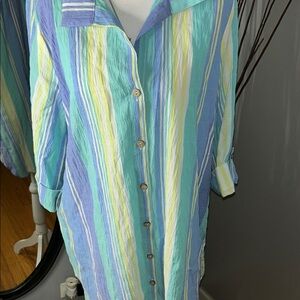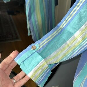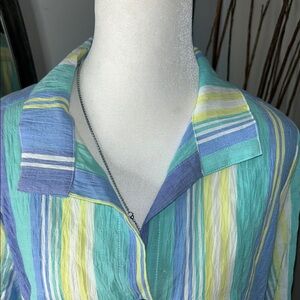 Stylish striped shirt with a classic collar. Features blue, green, and yellow stripes. Perfect for casual outings.