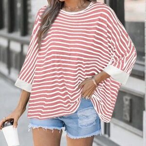 Striped Color block Round Neck Loose fit 3/4 sleeve top