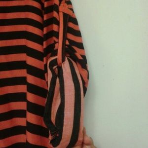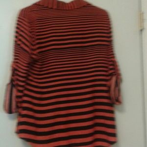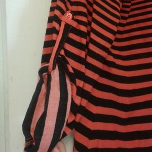 Shirt material is kind of thin, but comfy and soft. Striped design is all over the shirt, the sleeves can be rolled down, though they do not have their own button at the wrist cuff. Coral colored. Can be worn fully buttoned or open with a layered outfit, even half-buttoned, or whichever way you like. Worn a few times.
