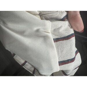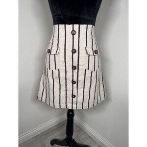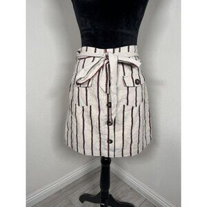 Striped Cotton Linen Blend Knee-Length Skirt With Button Front & Tie Waist
