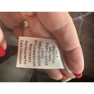 This knee-length skirt features a cotton-linen blend fabric, button-down front, and dual front pockets. Its versatile tie can be styled front or back.