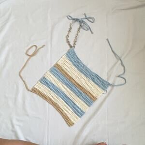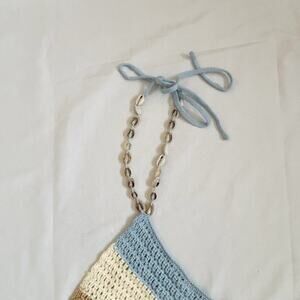 blue, beige and tan striped knit crochet halter open back top with puka seashell beaded accent at neckline.