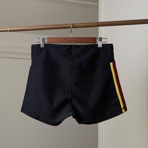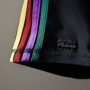 This is a pair of Derby Skinz athletic shorts with green, purple, red and yellow stripes. They were made for roller derby, but the versatile fabric can be worn for skating, dancing, SUP, or other sports.