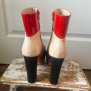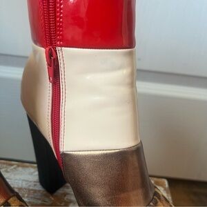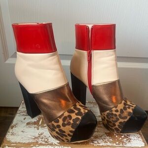 + with black heel, leopard detailing and red and pleather white stripes. 5” heel NOTE: heel guard is missing. Size US 7