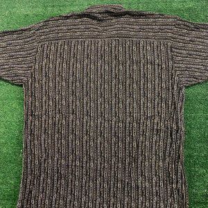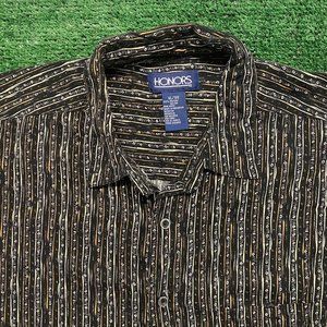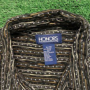 Black short sleeve button up casual shirt by Honors with tan and beige stripes and dots pattern. Baggy fit. 100% rayon