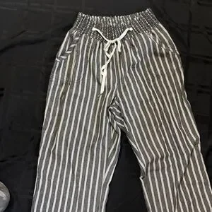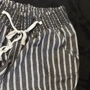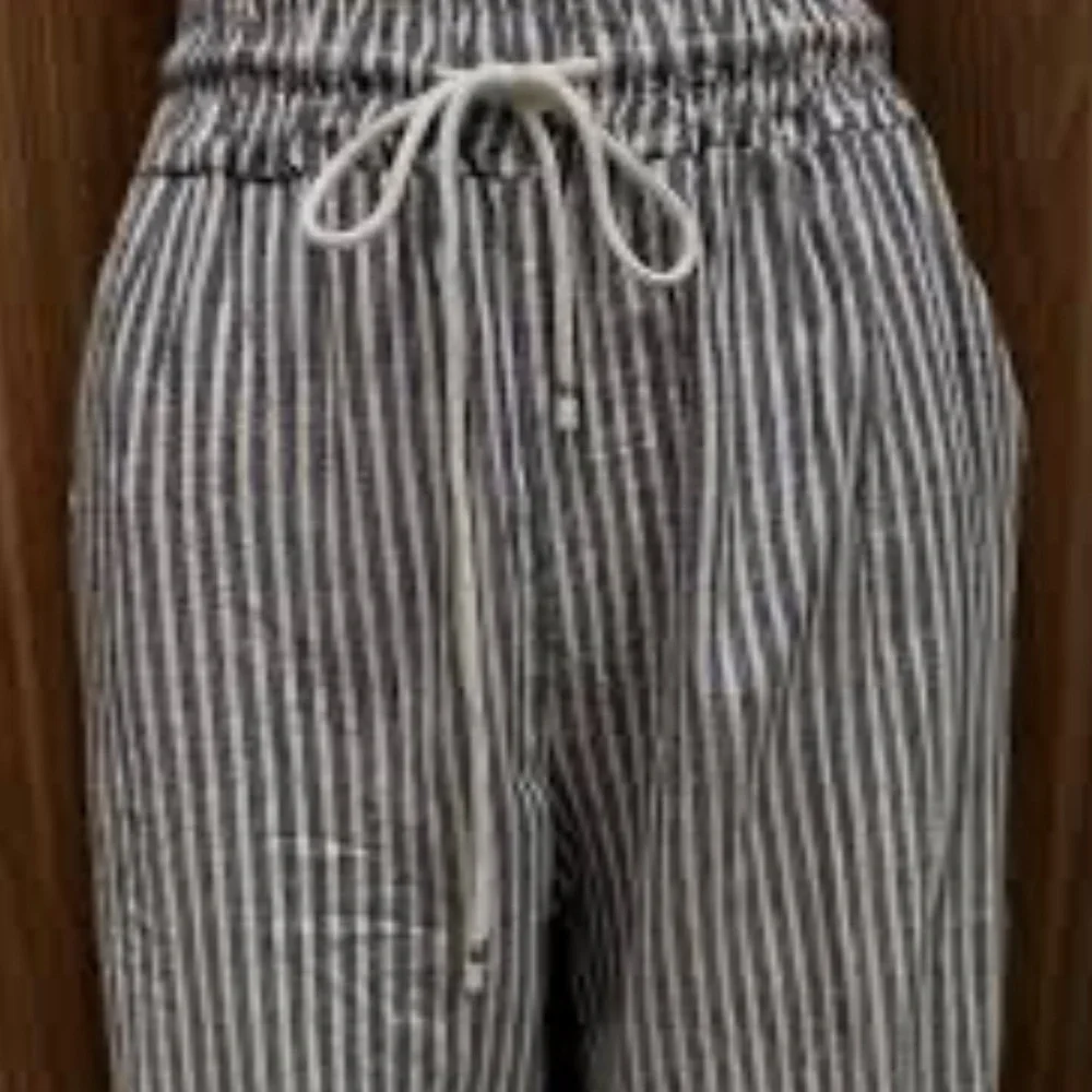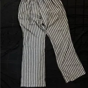 This is a pair of striped wide-leg linen blend pants with an elasticated drawstring waist and 2 front pockets. It’s size large but it’s more like a medium/large because of the elastic waist band very comfortable. New without tags it’s a dark grey black with white color