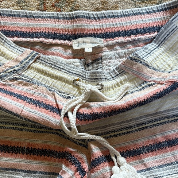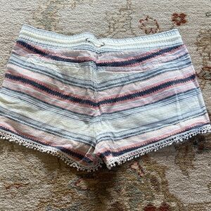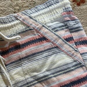 Casual striped shorts with a drawstring. Features pink, blue, and cream stripes.